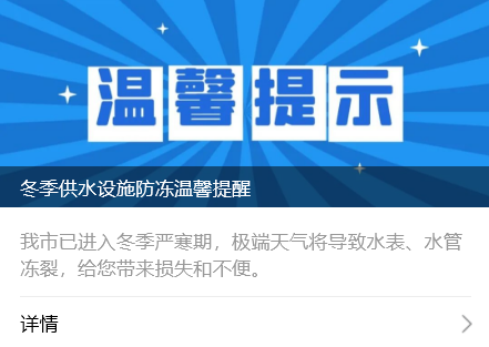 襄陽中環(huán)公司呼吁廣大用戶在極寒天氣再次來臨之際,積極配合,采取防凍保暖措施,共同抵御寒流,保障正常用水。